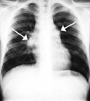 The commonest causes in India for this gland enlargement ( as seen by the arrows in the xray on the right ), are tuberculosis, sarcoidosis, cancer of the lymph glands or a non-specific infection. As the treatment for these conditions are different, it is important for the treating physician to have a microscopically proven diagnosis.