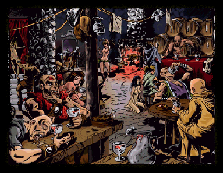 Finding a small table in a corner where we could have our backs protected by a wall and still observe most of the room, we sat down and Dragon begin slamming his fist on the table, yelling loudly in my ear for paga. A rather useless gesture I thought, since the noise in the place was near deafening anyway, but Dragon was young and impatient, and not at all given to being ignored. I, of course, being the older brother had learned to wait a bit and let things come to me. Ehns passed and eventually, a beautiful redheaded slave appeared out of the persistent din and smoke. Dragon raped her at least five times with his eyes and then ordered paga for the both of us. The girl seemed slutty enough for any warrior, but I really wasn't paying close attention to her, my mind being more on paga and a meal than pleasure.