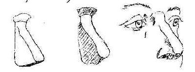 This appears easier than drawing the nose in the front view, but this is only partly true. While you can more easily percieve the shape in profile and therefore more easily draw it, it's more difficult to make it appear solid. This is one of the problems you'll encounter in drawing any of the features, and even the head itself: The drawing will look flat in profile, like a silhouette. |