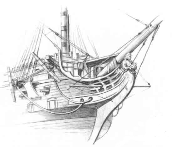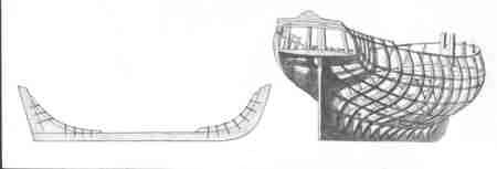 The lofty stern with windowed glass in quarter galleries, the bluff bow, and the heavily ornamented beak head forward - these are incidentals. The sturdy hull itself - as in wooden vessels of all ages - was built up from a massive timber, heavily reinforced, that extended the full length of the ship. This was called the keel or backbone. It curved into the stem forward and the sternpost aft. Between stem and sternpost were closely placed rib timbers, molded to form, to which the outer planking and inner ceiling were spiked.