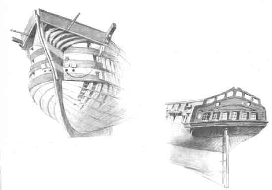 ABOVE LEFT; The bow of a French three-decker, about 1820. ABOVE RIGHT; The stern of an English frigate, early Nineteeth Century.