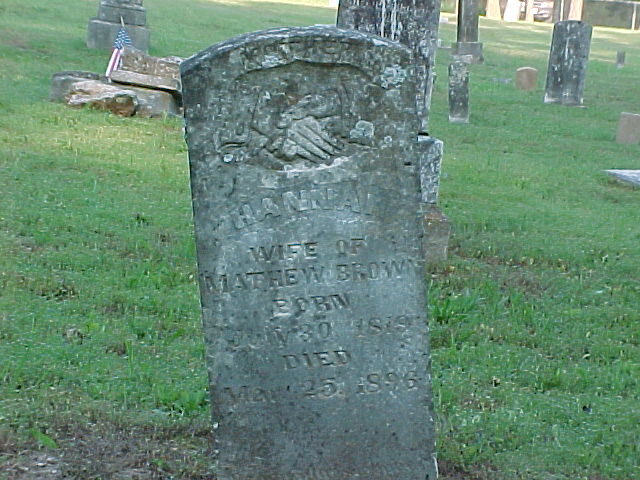 It is located near the center of the cemetery near the large walnut trees. Graves nearby include the Flutys, Thompsons, Wells and Browns. To the left of Hannah's grave is that of Charley Thompson and to the right is her husband, Mathew Brown.