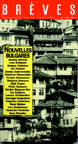 In the end of 1999 came out the French magazine for contemporary novelistic "Breve", ¹ 58. 19 Bulgarian short story writers from 90-Es are represented in it: Alexei Hristov (Sofia), Ivan Andonov (Haskovo), Stepan Poliakov (Sofia), Ivo Hristov (Sofia), Danka Dobrovolska (Shumen), Vladimir Shumelov (V. Turnovo), Iordan Atanasov (St. Zagora), Snegana Ivanova (V. Turnovo), Alek Popov (Sofia), Petar Spasov (Sofia), Dimitar Stoianov Nov (Sofia), Georgi Gospodinov (Sofia), Virginia Zaharieva (Sofia), Boris Minkov (Sofia), Ivan Suhivanov (Burgas), Stancho Penchev (Shumen), Sava Vasilev (V. Turnovo). Top |