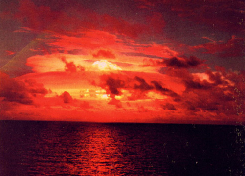 I witnessed the explosion on board a navy vessel 35 - 40 miles south of the shot. With my back turned and eyes shielded, the feeling of intense heat was comparable to going from the cool of an early morning drizzle, to the heat of a mid-summer noonday sun-all in the matter of a few seconds. When I was able to view it the sight I saw was the first picture above. Eerie and awesome - this was all taking place in complete silence. It wasn't until several minutes later that the shock wave and sound like a shotgun arrived, followed by long rolls of thunder that echoed and re-echoed across the ocean. That bright churning mass of burning debris formed itself into a ball and began climbing, churning and burning until it finally began forming a white frozen cap on top. The mushroom began to form and to turn white as it cooled, as in the lower photo. It spread to over 100 miles wide, before it began breakup.