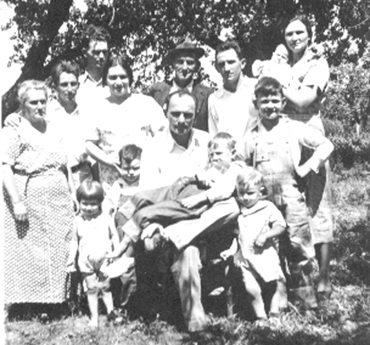 Adults: Grandmother Maggie Van Horn Purdy, son, Theodore, daughter, Clytie, with husband Irvin Bettag behind, Grandfather Milton Dewitt Purdy, son, Milton Jeremiah, my Mom Dorthy Bell Dixon Purdy, and seated, my Dad, Lemuel Monmouth. Children on left: Robert and Connie (Clytie), me Alfred D, on Dad's lap, Darrell at his knee, Julian behind, and Paul in Mom's arms. I had a sore foot from stepping on a garden rake, which completely pierced it.