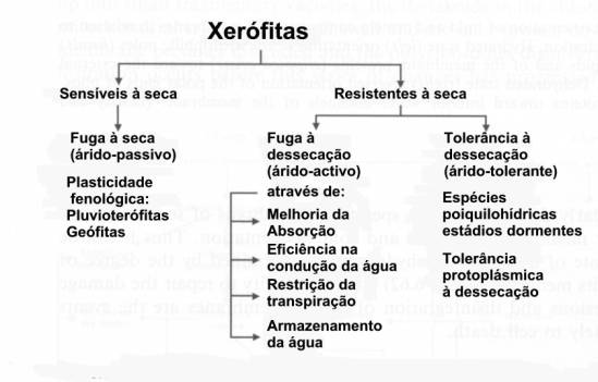 Os mecanismos de sobrevivência das espécies xerófitas, isto é, das espécies que sobrevivem em regiões secas são sumariados na figura 56 (Larcher, 1995).