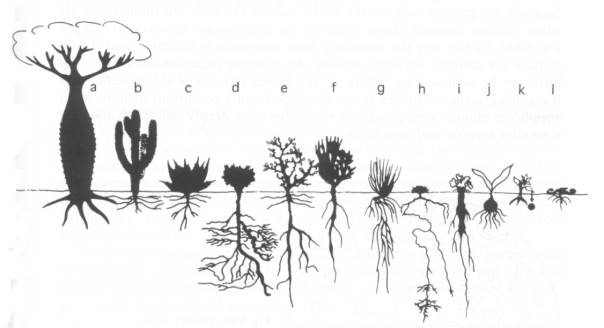 Esta estratégia implica a existência dum sistema radicular extenso com uma grande área de superfície de absorção que pode ser ainda melhorada por um rápido crescimento para camadas de solo mais profundas (figura 57, d) e e). As raízes das plantas das estepes e dos desertos podem atingir profundidades muito grandes. Grande parte destes sistemas radiculares pode ser suberizado ou pode armazenar água. Para estas espécies a situação pode tornar-se grave quando não existe espaço para o sistema radicular se expandir. As plantas com grandes sistemas radiculares (especialmente as árvores) que se desenvolvem em solos pouco profundos são particularmente sensíveis à seca. Este é também o caso das plantas que se tenta colocar nos telhados, túneis, etc. Mesmo nas zonas húmidas as plantas a utilizar nestas condições devem ser resistentes à seca, pois são as únicas que se aguentam com pouca água armazenada num volume limitado de solo (Larcher, 1995).