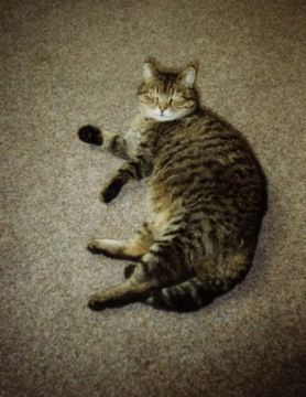 My mum and Jeffrey have two cats both stripey and very affectionate, one called Bobs who is stripey all over and the other one is called Penny; she has got a white chest and white paws.