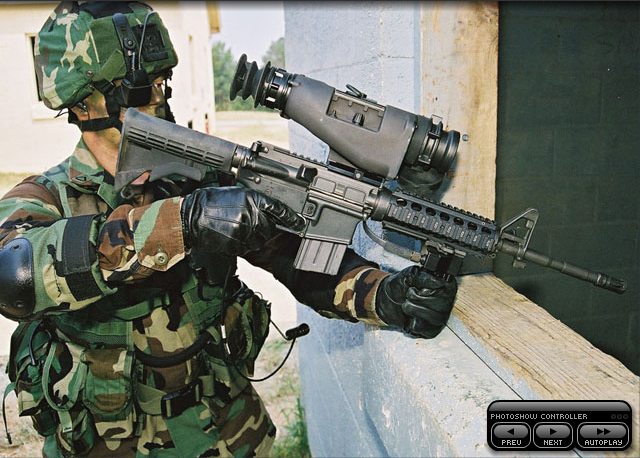 6. A soldier at Fort Benning aims his M4 Carbine during a training exercise with Land Warrior.