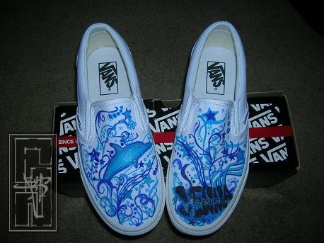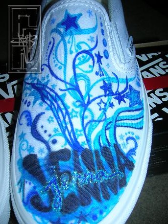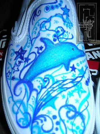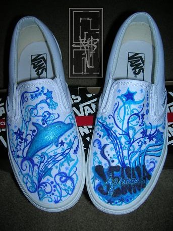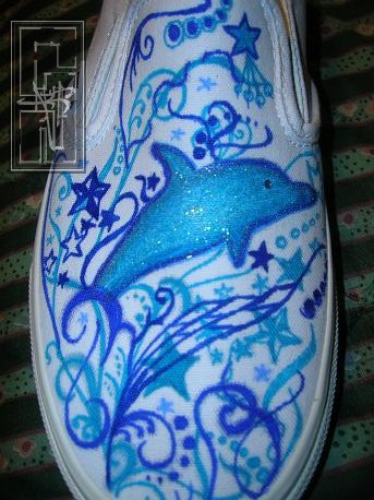 Details: on the right foot there is a dolphin with glitter on it and on the left foot there is jenna's name and on both shoes there are stars and swirls wmade of different shades of blue and a hint of glitter