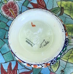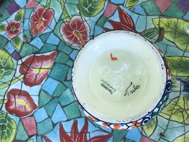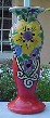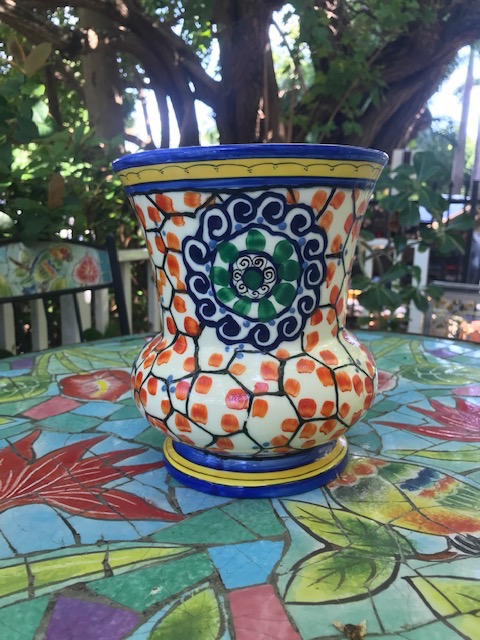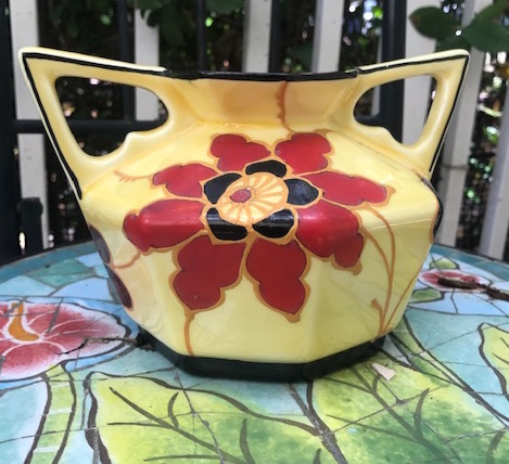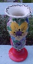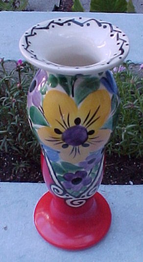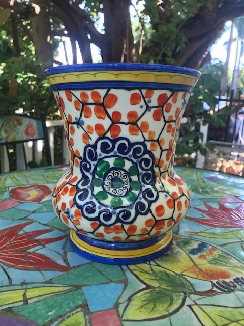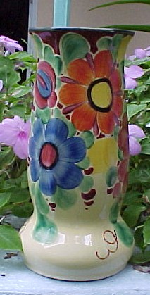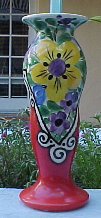This Fantastic Ditmar Ubach vase was produced in the 1920's-30's. This piece is 5" x 8" in a rare geometric mold and a wonderful slip hand-painted design. --- $150------