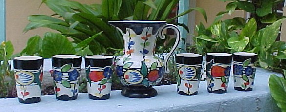#8L Czech Art Deco Pottery Lostro Pitcher and 6 cups hand-painted---$325.00----