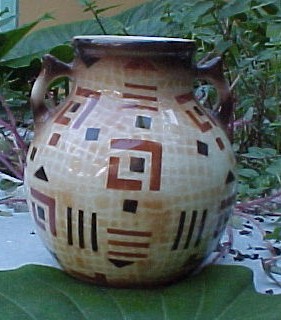 #XX1-Czech Art Deco Pottery 2 handled Vase Airbrushed Spritzdecor in an Aztec design imported by the Celebrate company probably produced by the BIHL factory ---$55.00--