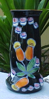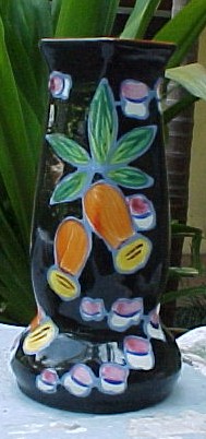 Pottery Vase in a heavy slip design and black background. This Vase was produced by the Ditmar Urbach company and is 8" in height---SOLD---