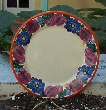 P2O Mrazek Peasant plate cream background orange trim blue flowers 8"---$35.00