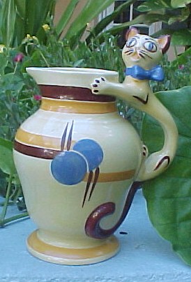 #3N- Ditmar Urbach Art Deco Hand-painted Cat and Mouse Cat Handled full sized Pitcher. This is a crazy rare item. This jug combines the look of a Cat handled pitcher, a Cat and Mouse animal piece and a full sized DU Pitcher. This piece is nearly 8" x 10"-------