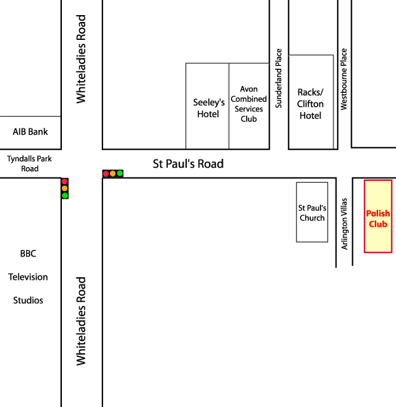 lights by the BBC Television studios in Whiteladies Road, turn into St Paul's Road.
