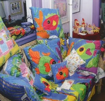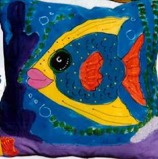 Dena's pillows will brighten up your beach-front home or winter retreat. Her hand-painted pillows, as featured in Coastal Living magazine, are 20" by 20" and come in many fun designs. They are machine washable and painted with non-toxic fabric paint. You can choose to have them ready-stuffed or with velcro openings for easy self-stuffing. Smaller, less detailed pillows (10" by 10") are also available and are ideal for children's rooms.
