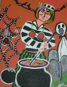 Martha has to wear her prison-issued black & white uniform; still she wanted to dress up in a costume. So instead of the more predictable witch (to go with the cauldron), she decided to be a hula girl. That way she could mentally transport herself to the islands, Hawaii in particular, to dream of hanging out at a beach luau, complete with a pig roasting in the spit, tiki torches reflecting the ocean waves, and hot beach boys delivering Mai Tais.