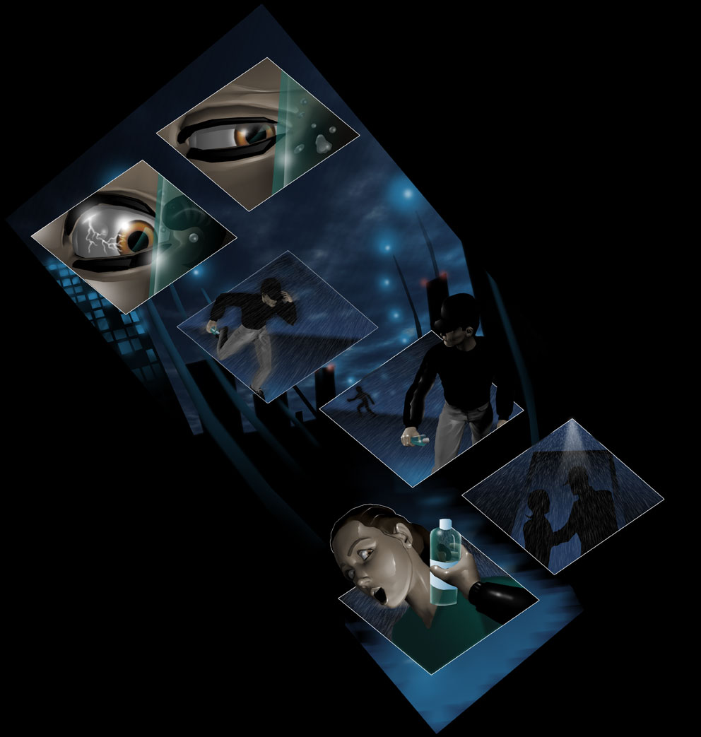 The pages are on their sides because the idea was when the book was printed, it would look like a diamond when closed. We were opting for this thought because we also wanted the package to look as different as it's interior. So when opened, it would look like the page/pages below. This would make it look like there was more there for one to look at i.e. a cenimatic feel... wide screen. Some are already trying this, this was our method. On pages 6 and 7, the entire background was digitally colored as were other elements. The characters again, are 3D.