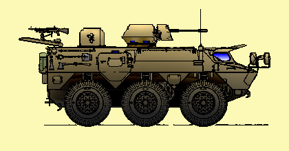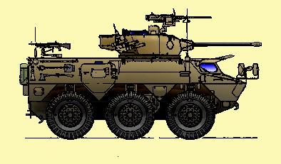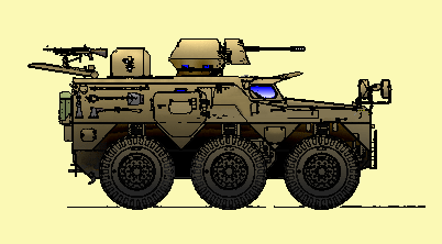 Armament would be a RARDEN or Bushmaster II gun fitted alongside a MG and a 81mm gun-mortar. The mortar could be used to fire canister, HESH, HEAT or CS. The 30mm would be particularly effective against light infantry/guerillas with ABM ammunition. A Heavy Support variant could mount a 60mm HVMS, T 60/70 or 76mm GT4.