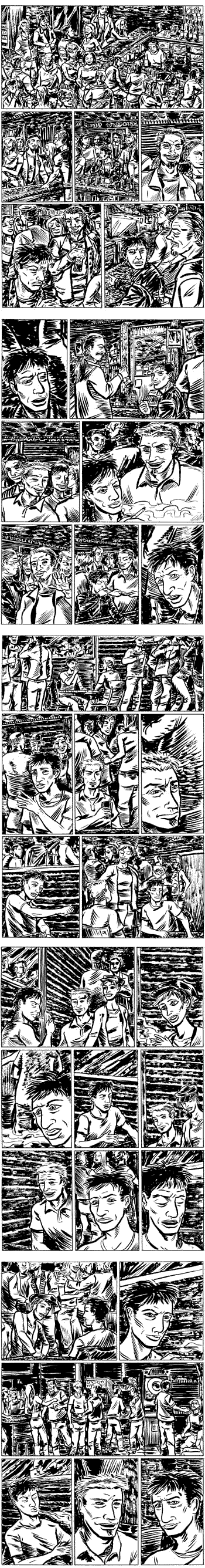 Initially Moe was to bump into a guy from his video project, then find Mark - also the conversation with Mark and Lynn went on for a few more pages. An even longer scene was scripted but not drawn, where Moe got drunk and belligerent before leaving for Nicole's. While it's nice for the main story to take place in a fleshed-out world, I think if left alone this scene would have had too many trivial details.
