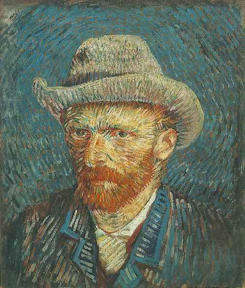 Two paintings in particular impressed me: Self Portrait in Felt Hat, and Landscape at Twilight. The self portrait is the single most compelling and electrifying work of art I've ever seen. It is literally hypnotic. After looking at it for about five minutes, I wandered off, to return twice more for briefer looks. Aside from the technique of bright colors laid down in a pattern that radiates from the portrait's eyes, the facial expression finally came through as very sad, making the painting more than an abstract triumph of imagination and technique. Every brush stroke seemed perfectly controlled and perfectly placed. A man said, "I want to take it home with me." I replied, "I'd never get any sleep," meaning, first, that I could hardly take my eyes off it, and second, that it haunted my mind while I wasn't looking at it.