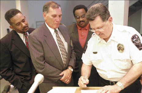 Pictured left to right: Bladensburg City Manager, Rodney Foxworth, Bladensburg Police Chief Robert Zidek, Bladensburg Mayor, David Harrington and Mount Rainier Police Chief, Fred Keeney