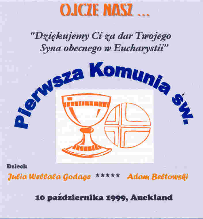 UROCZYSTOŚĆ I KOMUNII ŚW. Dnia 10 października na uroczystej Mszy św. o 10.30 odbędzie sie uroczystość I Komunii św. Do pełnego uczestnictwa w Eucharystii przystąpią JULIA WELLALA GODAGE i ADAM BELTOWSKI. Julii i Adasiowi życzę radosnej i wytrwałej pielgrzymki z Panem Jezusem przez życie i by zawsze pamiętali, że przez swoją pierwszą Komunię św. nawiązują z Nim głębszą przyjaźń. Dziękuję rownież p. Marysi Malczewskiej i Siostrze Jadwidze OP za pracę katechetyczną. Składam gratulacje rodzicom za dzielne spełnienie obowiązku przywożenia dzieci na przygotowawcze spotkania i życzę dużo łask Boga szczególnie udzielanych we Mszy św. podczas uczestniczenia w niej całej rodziny. SZKOLNY