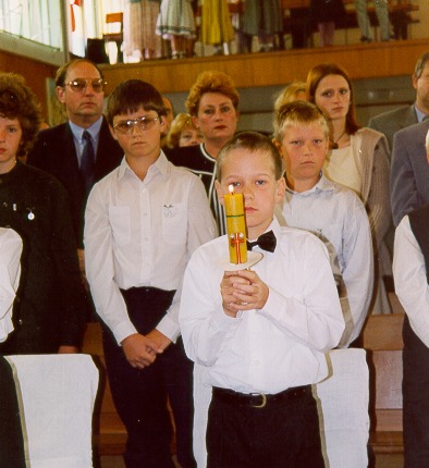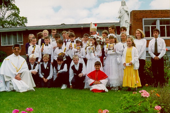 Uroczystość przyjęcia 1-szej Komunii i sakramentu Bierzmowania przez grupę polskich dzieci.