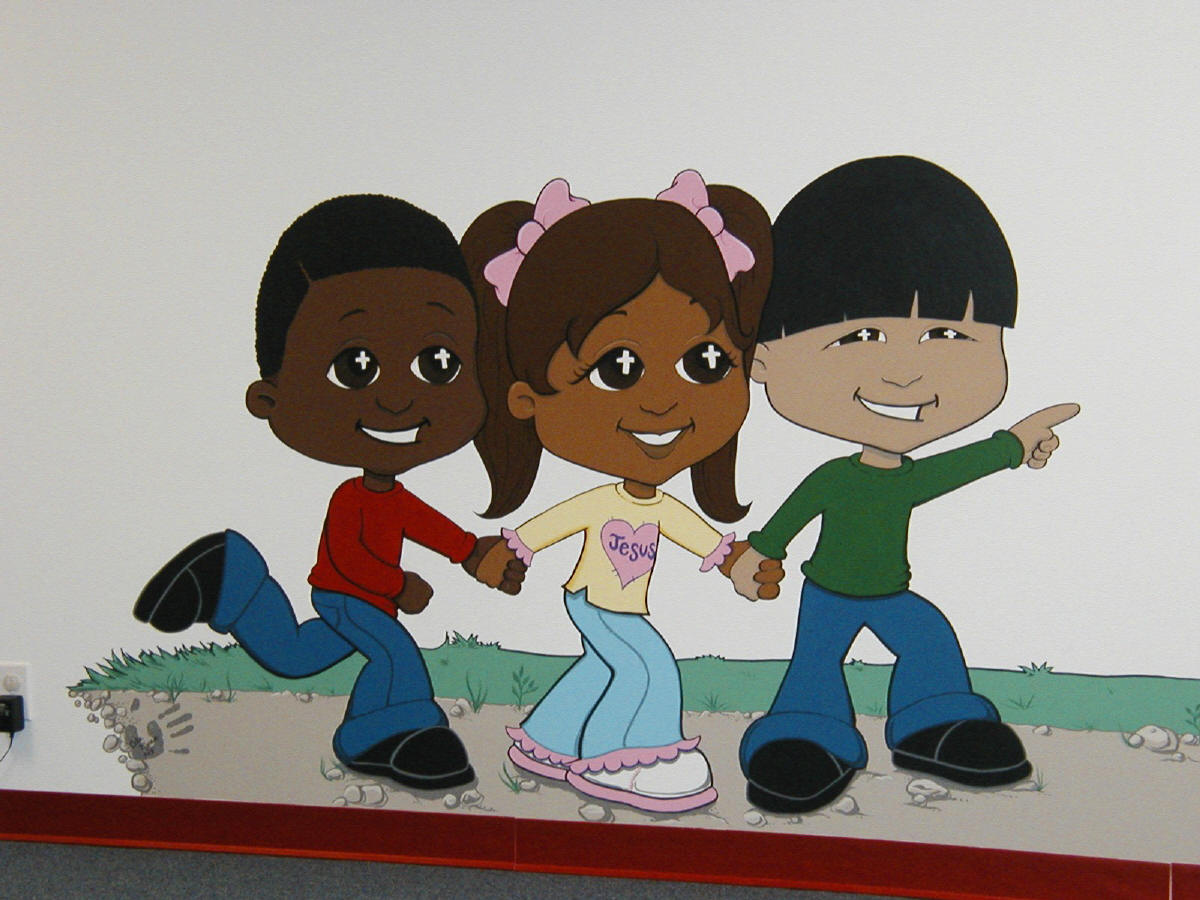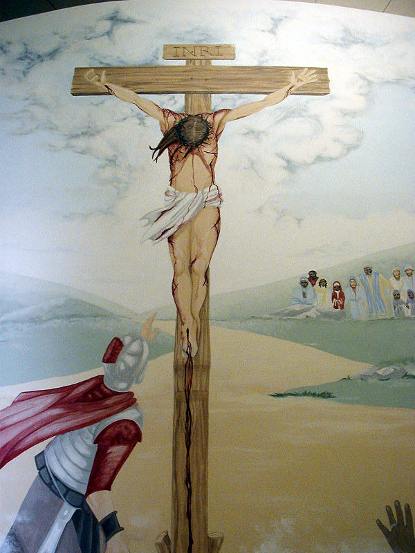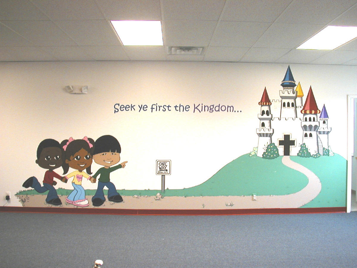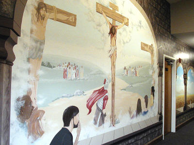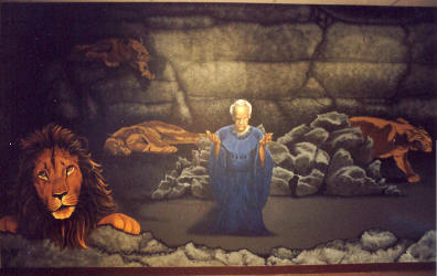 I have many examples of murals below. I also use several Faux Finishes and even some Trompe L' Oeil (trick the eye) effects in my murals. Some pricing information can be found just below the murals. I can also duplicate any mural or a variation of any mural you see here at your own church. I can also work with any theme you may already have to design murals or other works such as are seen on my custom artwork page. Links to other services can be found at the bottom of the page. Click on either thumbnail to see the larger image. Use your browsers back button or right click then select back to return. Starting PricesFor Churches, Ministers and other Christian Artists click here. In order to give an exact quote, I would need to look at all of the needs involved. However, I have come up with the following prices to be used as only a starting reference. As mentioned before the actual price depends on the size, amount of detail involved, accessibility, things like that.