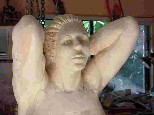 This is the first cut of the Britannia's face and arms, making sure that the cheek bones and the muscles in the arms are correct. Leaving everything on a slightly larger scale is good practice. As the carving progresses, you take a little off here and a little there as you look at the "whole" body, stepping back a distance and viewing from "all" angles.