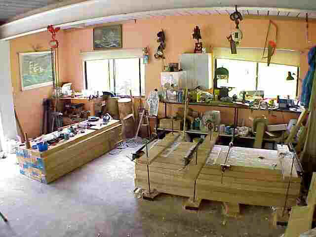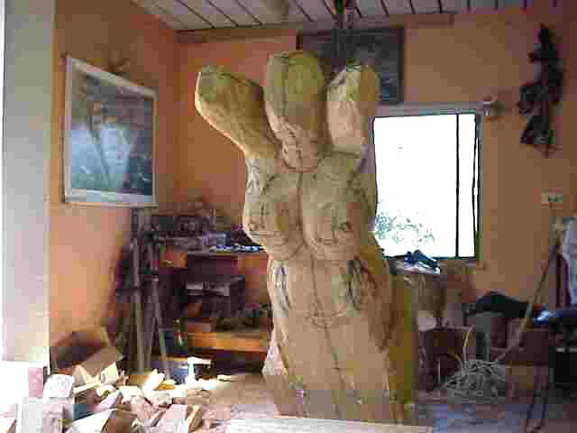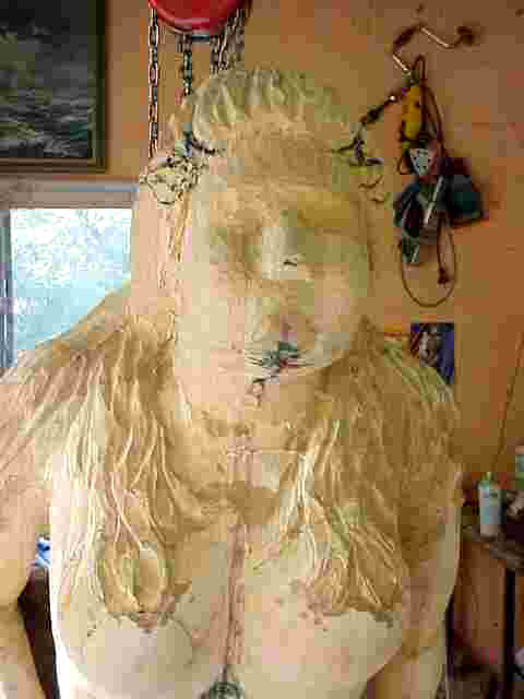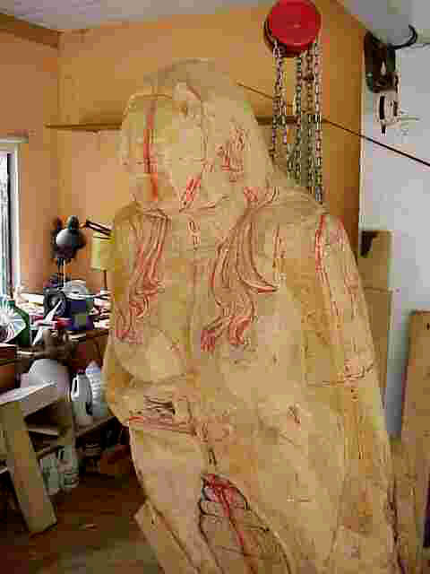 This picture shows the planks of wood laminated into 500kg blocks ready for carving. The gluing-up process was done in stages, over several days and clamped and doweled in all directions. The grain of the wood is all in one direction and careful assembly is exercised when end grain falls in critical areas - i.e. face, hands etc. (difficult to carve).