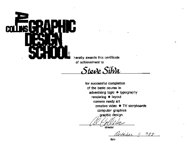 The above picture is a scan of certificate awarded me at the completion of the 800 hr course in design logic