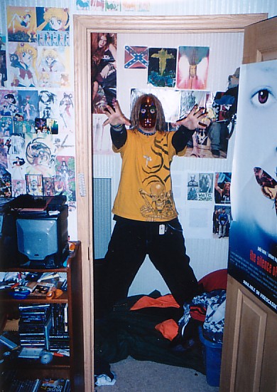 Louis in a mask in a closet