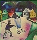Chagall's paintings - save for a few of his earliest works - at first glance appear full of whimsy. The images he fills his canvas with seem disconnected, a hodgepodge of memories from his childhood in Vitebsk, Russia. A common motif, and one he employed throughout his life, are of figures seemingly floating or flying above the landscape, often upside down. It's a topsy-turvy world he conveys through his brush, begging of symbolism. But as Chagall himself said of his paintings, "I don't understand them at all. They're not literature. They are merely a pictorial arrangement of images that obsess me . . ."