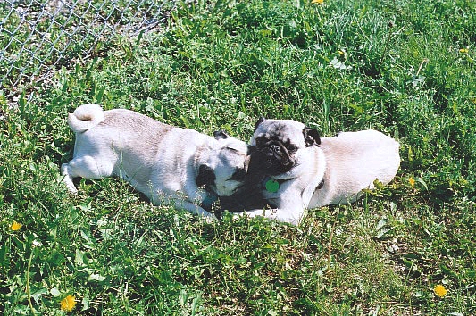 Just a beautiful day for groovin'. Here Robin's Lucy, with the Cleopatra eyes, exchanges pug greetings with Bailey (Rose) of Barrhaven, both finding a new pal for the day.