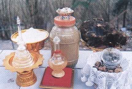 Some of the holy ingredients and material used for making Nur Phong amulets, note the container containing some brown colour powder and the bowl of white colour powder, and liquid substances and some other ingredients which had yet to be powdered.