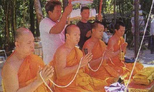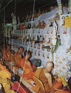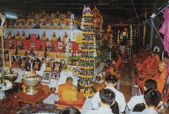 Note how the many monks sat lined up in the temple hall around the amulets and each monk had a small bowl of Nammon beside him.