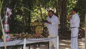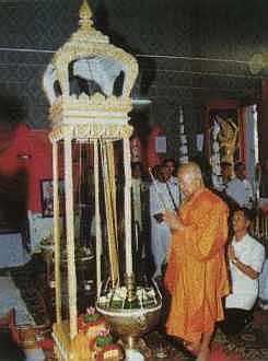A Luang Phor lighting the consecration candle, notice that there is also a big bowl of Nammon beside the consecration candle. Back to Home Page |