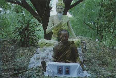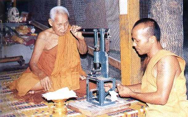 Luang Phor Liam hand-moulding the powder based amulets/Nur Phong, a disciple is helping him.