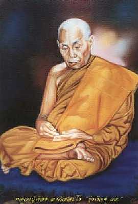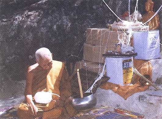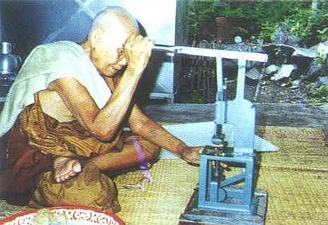 Luang Phor Liam chanting and consecrating the amulets after all the amulets were made. The boxes of amulets were tied together by a white string, known as Saisin, and one end was probably tied to a main Buddha image too, Luang Phor holds the balled end of the Saisin while chanting or meditating. Note the bowl of holy water with a candle lighted within, the water is known as Nammon, which was sprinkled upon the amulets.