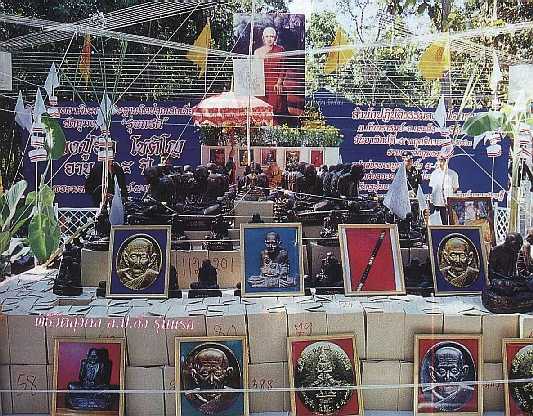 A scene from a mass chanting/consecration ceremony, it appears to had took place outdoors in the temple compound. Notice that the amulets were likewise packed into boxes and piled up with the statues to be consecrated together stacked on top of them, the Saisin were tied around the amulets and statues, and arranged in a spiderweb manner above the stack of amulets and statues.