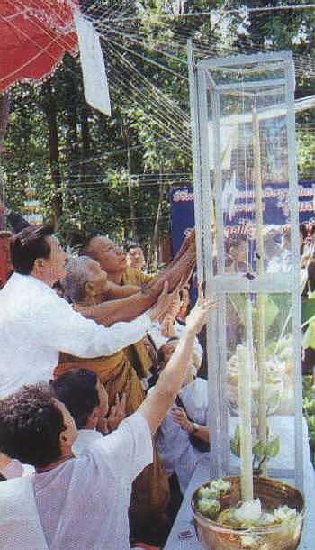 A Luang Phor lighting the consecration candle, the long candle was placed in a transparent wind shelter, to prevent it from extinguishing during the consecration. Note the bowl of Nammon placed beside the consecration candle, where lotus flowers were placed within the Nammon.