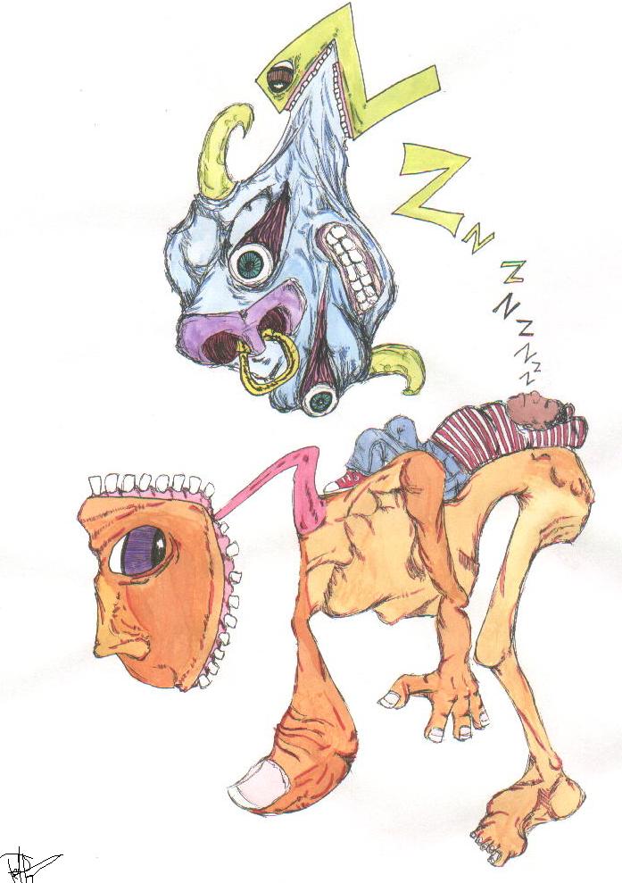 This one has gone through a bunch of titles, but it's been worked on in pieces. At completion before the coloring, it's title was an indictment of a person who's in charge of a certain local art institution. But I thought better of it before I put it up for public display here on the internet. I gave it the name of a Sonic Youth song. I've been kinda weak on titles lately. The coloring was done this morning/afternoon. I was planning on putting up the uncolored version and after I scanned it, I was looking at the image and figured it needed color. Um, I think I should point out some of the details here. The orange guy, his head is opened up very wide. the tongue goes out and acts as a neck attaching the body and the head. Then there's a kid lying on the creature's back, he's sleeping, so his "Zs" are going into the air, and the last one is vomiting out what could have been a bull at one time or another.