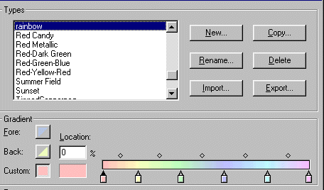 Click on edit, now at the top you should find the word new. Click this and type in rainbow or whatever you want to call this gradient. Now in the next section of this tab, there is a place to make new gradients such as the following: