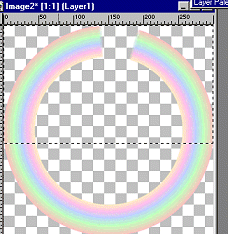 Now go to your selections tool once more and using rectangle, feather 0 antialised checked. Draw a rectangle over the top half of your coloured partially completed rainbow. The following is what you should have: