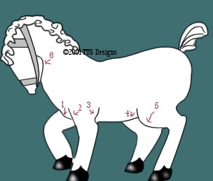 Our horse is almost done. Next we need to add a few lines to define the body of the horse and to add her eye. Using your mover tool click anywhere on the horse body, do not move, this just highlights this layer or look through the layers and highlight this layer. Go to select all, select float. Make your fill colour black. Get the draw tool and reset the draw to freehand stroked, width 1, antialise checked, vector not checked. Following the next diagram add lines, follow the numbers.