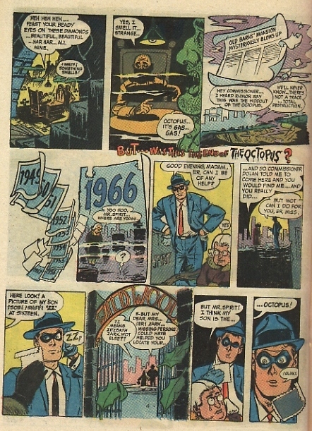 The Life Story of The Octopus was published in the Harvey Comics 1967 The Spirit #2. All copyright to these pages belongs to Will Eisner © 1999. Clicking on each page number will bring up that page in a separate browser window. Please note that the images on each page are over 200Kb, so may take a couple of minutes to fully load. If you have not seen the page on the secret origin of The Octopus, click here. Page numbers |
