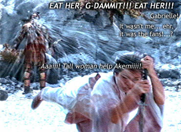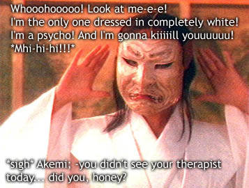 Aaaaaaaaaaah! The sixteenth page! RUUUUuuuuuuuuuuN!!! *heheheh* Ok, this is turning into an addiction. I'm hunting for more screengrabs on the net, hopefully I'll find some. Maybe this is the last page and maybe not. I've been saying that for about...ehr... five, six, seven (?) pages now. We'll see. I KNOW that Fin extended version was shown today (nov. 3rd) but that doesn't change the fact that Akemi is a pain in the *** and that the story still is pretty lame n a ripoff. Watch some Hong Kong and Chinese action videos, and there you have it. So I'll continue to make these pics. |